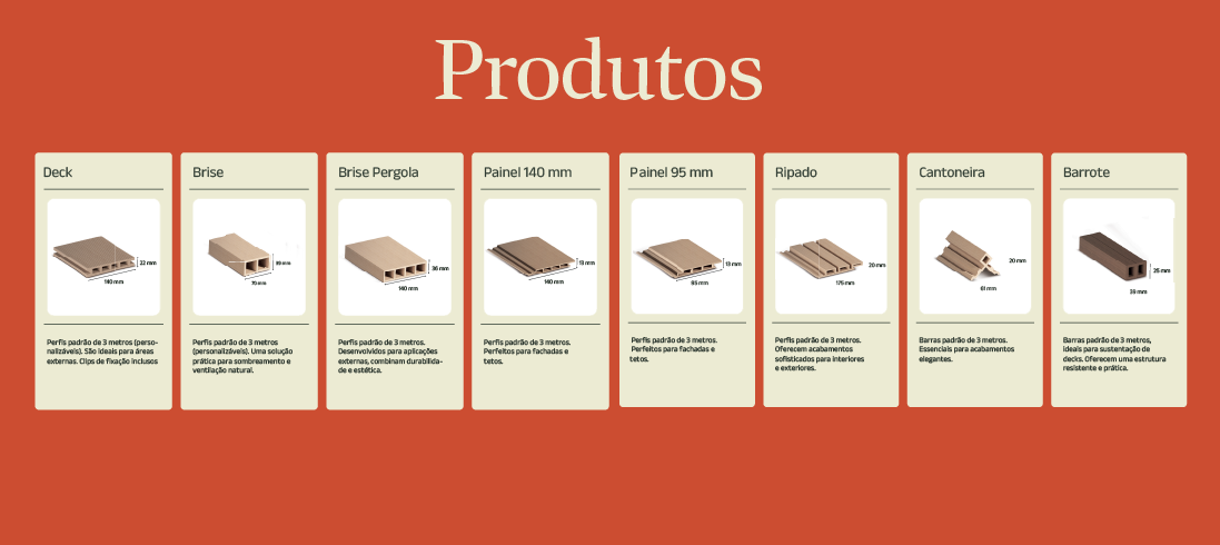 • Decks externos; • Fachadas arquitetônicas; • Ripados decorativos; • Brises; • Revestimentos para áreas molhadas e ambientes litorâneos;